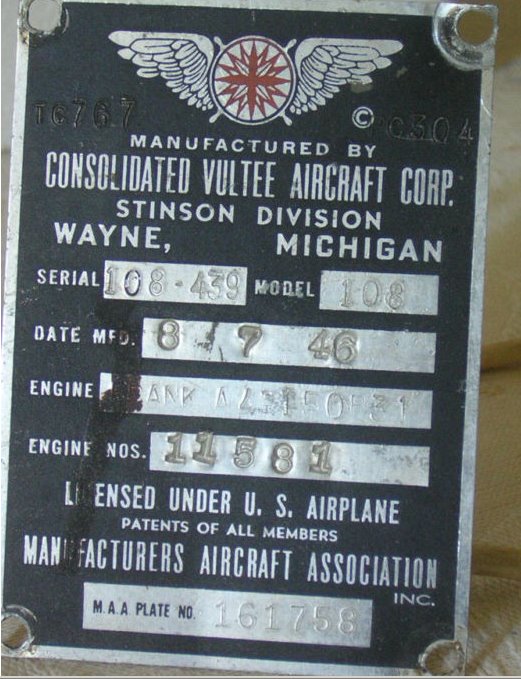 All Stinson 108's had the same type data plate. Images about